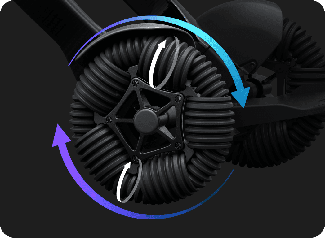 WHILL's patented technology with 10 compact rollers enables sideways movement and an exceptionally tight turning radius.